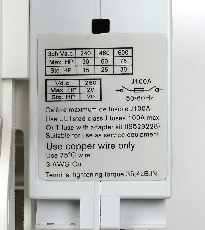 • DC FLA motor max. / 125 VDC (Hp/A):  7.5/58
